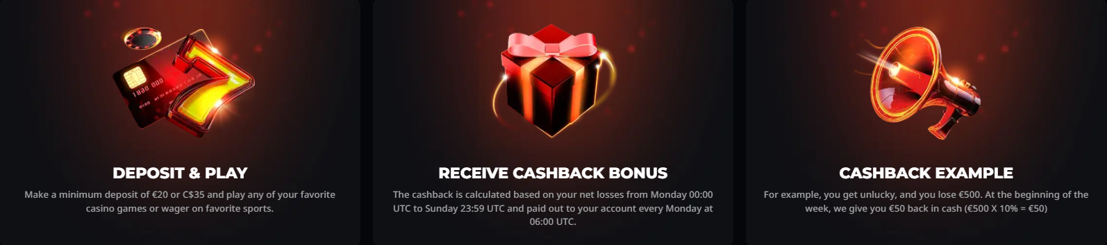 Elke maandag betalen wij 10% cashback uit, zonder inzetvereisten.